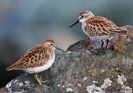 Least and Western Sandpiper resting on a rock. Oyster Bay, Vancouver Island, BC. Canada