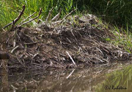Castor canadensis Beaver Biber A dam is made of branches, mud and rocks. This dams holds back the water and a deep pond is formed. The pond must be deep enough so water will not freeze to the bottom. Mount Robson Ranch,BC. Canada |