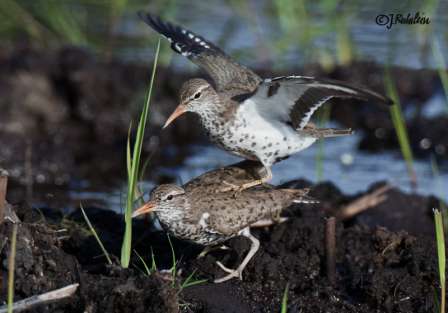 Actitis macularia Spotted Sandpiper Drosseluferläufer Once the female lays her eggs she will often go in search of other mates, leaving the male to perform the duties of primary parental care. The female may mate with up to four males at the same time. Cumberland, Vancouver Island, BC. Canada |
