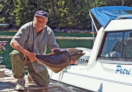 Joe with a small halibut. Discovery Point, Nootka Sound, west coast, Vancouver Island, BC.