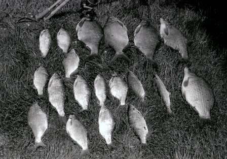 Four different fish species. A Saturday's catch from the Ammer rivermouth in the late sixties. Ammersee, Germany