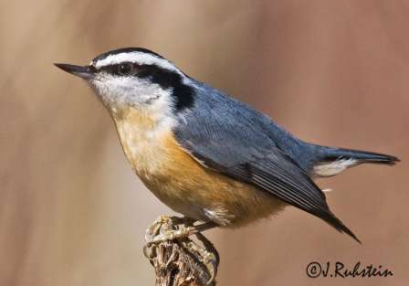 Sitta canadensis Red-breasted Nuthatch Kappenkleiber The nuthatch sits on its eggs in tree caves. It owes its name to the peculiar practice of gluing the cave entrance shut so that no robber can steel its brood. It covers the whole cave entrance with clay and only leaves a little hole just big enough for itself. Cumberland, Vancouver Island, BC. Canada |